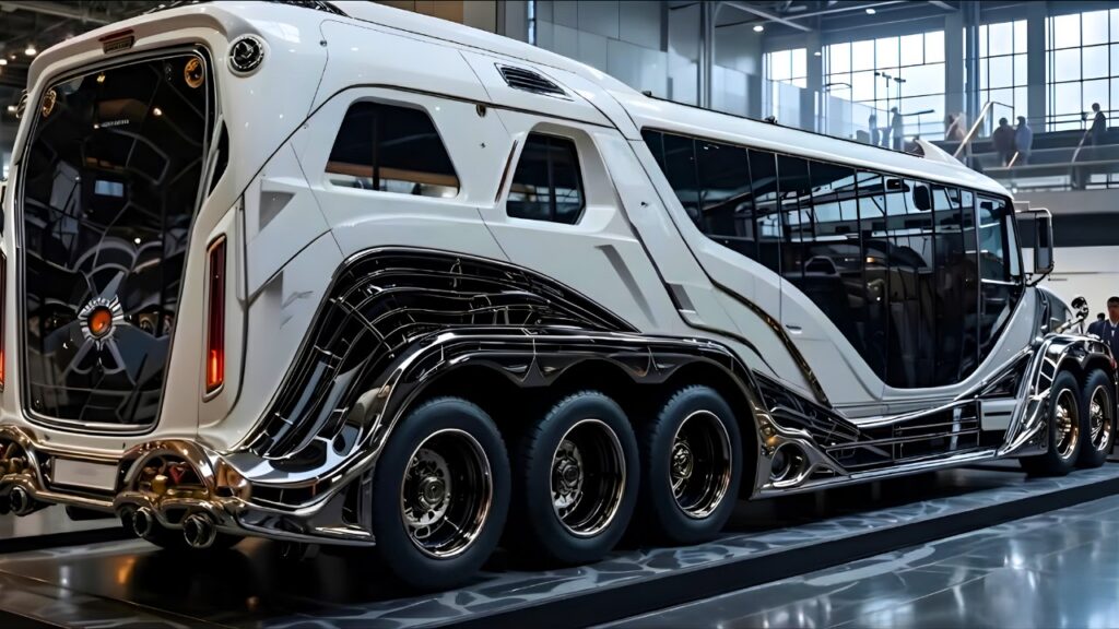 Massive wheels, heavy-duty bumpers, and integrated recovery gear make it adventure-ready. Practical touches like solar panels on the roof and exterior gear mounts prove it’s built for life beyond paved roads.